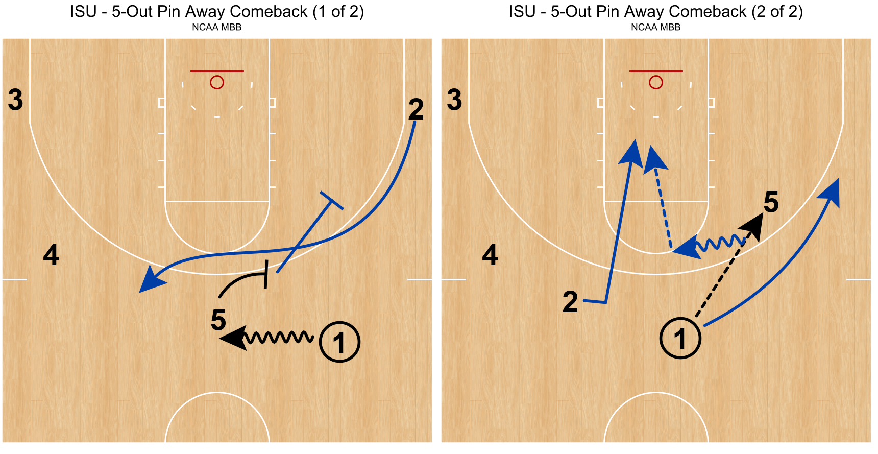 Indiana State places on an emphasis on back cutting (more on that later in the post and on the podcast) and employs a back door beautifully in this 5-Out action. The away screen from Avila for 2 is really just false action to get the guard to the other side of the floor and make the defense chase. Avila comes back to get the ball then fakes the handoff back to the PG. He plays to the next by dribbling towards the 2 who acts like he’s coming to receive the handoff then back cuts his defender.