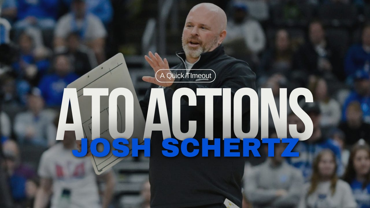 Recently on A Quick Timeout podcast, St. Louis Billikens’ Josh Schertz shared his philosophy for after timeout actions (ATOs) and how he prepares those for specific opponents (scroll to watch that clip). In this week’s A Quick Timeout+ newsletter, I share some of the best of those ATOs.